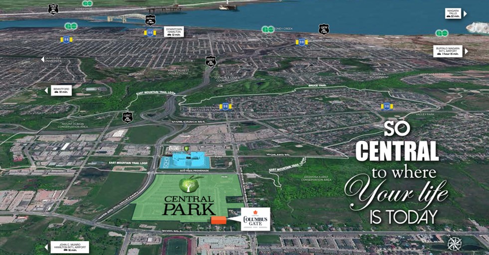 Located near Rymal Rd E & Upper Red Hill Valley Pkwy, the Columbus Gate Towns will locate future residents within a short proximity from a variety of shopping options. Including plazas, malls, and more. With Lime Ridge Mall approximately an 8-11 minute drive away. Offering shoppers a wide range of restaurants, services, and retailers.